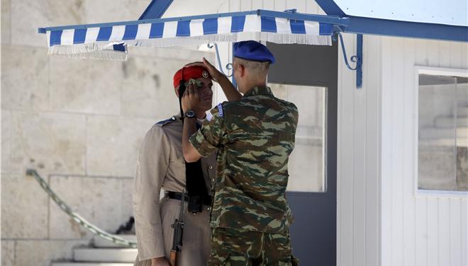 Αφθονος ρέει ο ιδρώτας του τσολιά στο Μνημείο του Αγνωστου Στρατιώτη, καθώς το θερμόμετρο άγγιξε τους 40 βαθμούς Κελσίου στο κέντρο της Αθήνας, την πιο ζεστή ημέρα του φετινού καλοκαιριού.