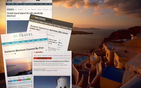 «Το νησί δεν έχει ρεύμα. Ξέσπασε φωτιά το μεσημέρι στον υποσταθμό των Φηρών», δήλωσε στο πρακτορείο πηγή της ΔΕΗ. Παρέθεσε ακόμη τη δήλωση του δημάρχου του νησιού ότι γεννήτριες θα έφταναν στο νησί τα μεσάνυχτα της Τρίτης. «Η Σαντορίνη είναι γνωστή για τα υπέροχα ηλιοβασιλέματά της και τα εκπληκτικής ομορφιάς χωριά, χτισμένα στους βράχους, και αποτελεί έναν προορισμό που προσελκύει χιλιάδες τουρίστες κάθε χρόνο», σχολιάζει το πρακτορείο. «Στο σκοτάδι η Σαντορίνη μετά από φωτιά σε μονάδα ηλεκτρικού ρεύματος», ανέφερε το Reuters. Χωρίς φώτα έμεινε την Τρίτη η Σαντορίνη, ένας από τους πιο δημοφιλείς τουριστικούς μηχανισμούς, όταν σταθμός παροχής ηλεκτρικού ρεύματος πήρε φωτιά και διακόπηκε η ηλεκτροδότηση σε όλο το νησί, συνέχισε το πρακτορείο. Το Associated Press έγραψε σε τηλεγράφημά του ότι «οι επισκέπτες στη Σαντορίνη δειπνούν με κεριά και ζεστή μπύρα μετά την διακοπή ρεύματος που προκλήθηκε από φωτιά σε υποσταθμό παροχής στο αποκορύφωμα της τουριστικής περιόδου. «Από τη φωτιά δεν σημειώθηκαν τραυματισμοί, ενώ η αιτία της φωτιάς δεν έγινε ακόμη γνωστή», ανέφερε το πρακτορείο.Η «Φωτιά στη Σαντορίνη αφήνει τους τουρίστες χωρίς ρεύμα» γράφει η βρετανική εφημερίδα Guardian, ενώ στο μπλακ άουτ αναφέρθηκαν η Huffington Post, Washington Post και το Fox News. «Το νησί της Σαντορίνης, ένας από τους δημοφιλέστερους ταξιδιωτικούς προορισμούς της Ελλάδας, χτυπήθηκε την Τρίτη από μια σαρωτική έλλειψη ενέργειας, ύστερα από πυρκαγιά στο εργοστάσιο ηλεκτρικής ενέργειας του νησιού. Το νησί είναι χωρίς ηλεκτρικό ρεύμα, καθώς ξέσπασε πυρκαγιά το μεσημέρι στη μονάδα παραγωγής ενέργειας στην πρωτεύουσα του νησιού τα Φηρά», ανέφερε το γαλλικό ειδησεογραφικό πρακτορείο, France24.To ιταλικό πρακτορείο RaiNews έκανε λόγο για ταλαιπωρία των επισκεπτών του νησιού, που διανύει την πιο έντονη τουριστική περίοδό του, ενώ επισήμανε πως η ΔΕΗ πρόκειται να αποστείλει άμεσα γεννήτριες ώστε να ενισχυθεί το σύστημα ηλεκτροδότησης.ΕΘΝΟΣ