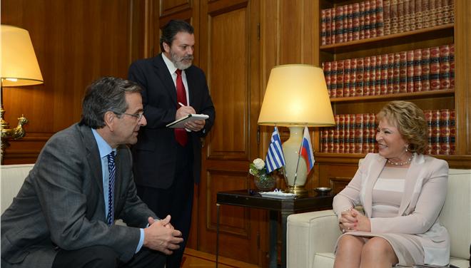 Η Βαλεντίνα Ματβιένκο, εξάλλου, επέδωσε στον Αντ. Σαμαρά προσωπικό μήνυμα του Προέδρου Βλαντίμιρ Πούτιν. Σύμφωνα με πηγές του Μαξίμου, που επικαλείται το ΑΠΕ-ΜΠΕ, η Βαλεντίνα Ματβιένκο ανέφερε πως υπάρχει «έντονο επενδυτικό ενδιαφέρον» από ρωσικές εταιρίες και εξέφρασε την κατηγορηματική βούληση της ρωσικής κυβέρνησης να στηρίξει με κάθε τρόπο αυτές τις επενδύσεις.