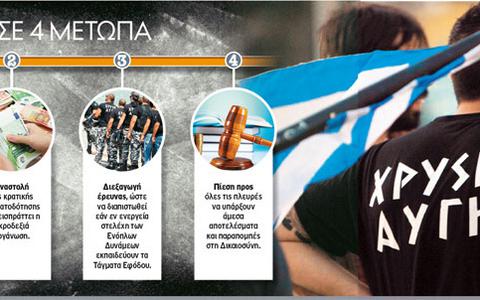 Ολα τα «όπλα» που διαθέτει είναι αποφασισμένη να χρησιμοποιήσει η κυβέρνηση στον πόλεμο που έχει ξεκινήσει κατά της εγκληματικής δράσης της Χρυσής Αυγής.Μετά την απόφαση για επιτάχυνση των ερευνών τόσο σε αστυνομικό όσο και σε δικαστικό επίπεδο και της προσθήκης που θα υπάρξει στο άρθρο 187 του Ποινικού Κώδικα, την οποία αποκάλυψε χθες το «Εθνος της Κυριακής», η κυβέρνηση αποφάσισε να «κόψει» και την κρατική χρηματοδότηση στο ακροδεξιό αυτό μόρφωμα.Η πρόταση αναστολής κατατέθηκε από τον υπουργό Δημόσιας Τάξης Ν. Δένδια και έγινε αμέσως δεκτή από τον πρωθυπουργό, ο οποίος έδωσε εντολή στον υπουργό Εσωτερικών Ι. Μιχελάκη να ετοιμάσει αμέσως τη σχετική νομοθετική ρύθμιση, η οποία πιθανότατα θα κατατεθεί στη Βουλή αυτή την εβδομάδα.
