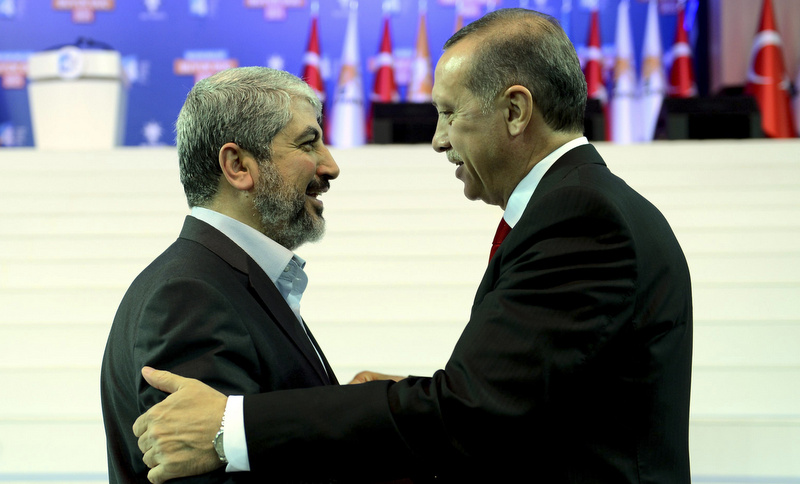 Turkey’s Prime Minister and leader of ruling Justice and Development Party (AKP) Tayyip Erdogan (R) welcomes his guest Hamas leader Khaled Meshaal during the AKP congress in Ankara September 30, 2012. Erdogan trumpeted Turkey’s credentials as a rising democratic power on Sunday, saying his Islamist-rooted ruling party had become an example to the Muslim world after a decade in charge. Addressing thousands of party members and regional leaders at a congress of his Justice and Development (AK) Party, Erdogan said the era of military coups in the nation of 75 million people was over. REUTERS/Kayhan Ozer/Prime Minister’s Press Office/Handout (TURKEY – Tags: POLITICS) FOR EDITORIAL USE ONLY. NOT FOR SALE FOR MARKETING OR ADVERTISING CAMPAIGNS. THIS IMAGE HAS BEEN SUPPLIED BY A THIRD PARTY. IT IS DISTRIBUTED, EXACTLY AS RECEIVED BY REUTERS, AS A SERVICE TO CLIENTS