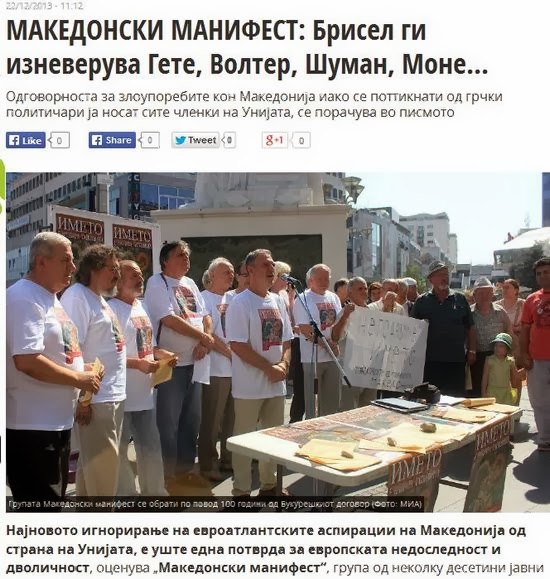 Στο «μανιφέστο» οι διανοούμενοι των Σκοπίων, παροτρύνουν την τοπική εξουσία να απορρίψει τους εκβιασμούς και τα τελεσίγραφα, με πρόφαση την ταυτότητα τους, καθώς επιδιώκουν να σβήσουν έναν ολόκληρο λαό, τον «μακεδονικό» από τον παγκόσμιο χάρτη και την καλούν να προβεί σε αναστολή των διαδικασιών ένταξης των Σκοπίων στην ΕΕ.
