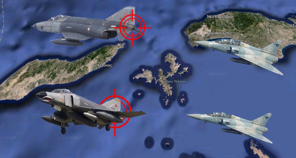 Ζεύγος Ελληνικών μαχητικών πήρε στο κυνήγι τα οπλισμένα F-16 που εγκτατέλειψαν τον σχηματισμό ενώ η τετράδα πέρασε πάνω απο το νησί Ανθρωποφάγοι σε ύψος 5.000 ποδών αφού Ελληνικά Μιράζ 200-5 χωρίστηκαν κυνηγώντας τα Τούρκικα !