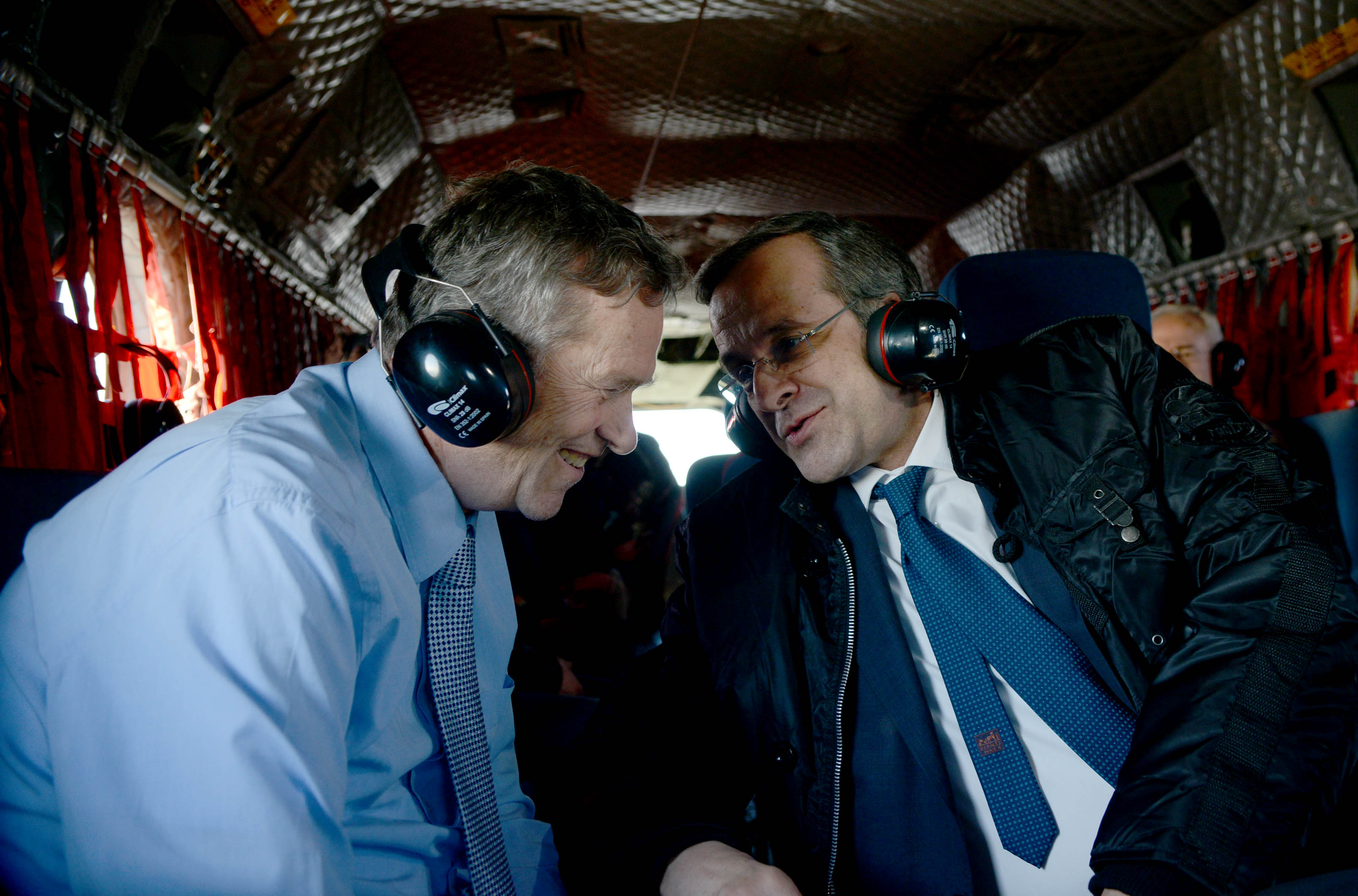 Κάνει θόρυβο το ελικόπτερο Chinook αφού δεν έχει σχεδιαστεί για πτήσεις vip αλλά για πολεμικές επιχειρήσεις. Τα προστατευτικά για την ακοή όσων δεν έχουν συνηθίσει λοιπόν απαραίτητα. Και σ΄ αυτούς συμπεριλαμβάνεται και ο πρωθυπουργός ο οποίος χρησιμοποιεί ένα από τα ελικόπτερα Chinook στην επισκεψή του στο Άγιο Όρος που βρίσκεται από χθες σε εξέλιξη. Πίσω του ο γραμματέας της κυβέρνησης Τάκης Μπαλτάκος δείχνει πιο…άνετος γιατί έχει “γράψει” αρκετές ώρες πτήσης με Chinook.