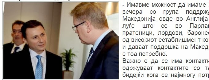 «Είχαμε την ευκαιρία να δειπνήσουμε με μια ομάδα υποστηρικτών των Σκοπίων, εδώ στην Αγγλία, με μερικούς ανθρώπους στο Κοινοβούλιο- βουλευτές, λόρδους, βαρόνους και ανθρώπους της υψηλής τάξης και οι οποίοι υποστηρίζουν τη χώρα μας.
