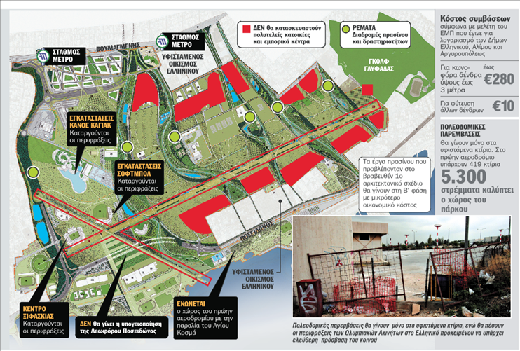 » Το πλάνο περιλαμβάνει τη δημιουργία πάρκου έκτασης δύο εκατομμυρίων τ.μ. – ένα από τα μεγαλύτερα πάρκα παγκοσμίως – υψηλού επιπέδου αθλητικές εγκαταστάσεις, ένα αναβαθμισμένο παραλιακό μέτωπο, όλα ανοιχτά για το κοινό, καθώς και τουριστικές υποδομές, δημιουργώντας έτσι έναν προορισμό που αναμένεται να προσελκύσει 1.000.000 επιπλέον τουρίστες στην Αθήνα».