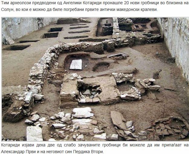 «Μια ομάδα αρχαιολόγων με επικεφαλής την Αγγελική Κοτταρίδη, ανακάλυψαν 20 νέους τάφους κοντά στη Θεσσαλονίκη, στους οποίους, ως φαίνεται, είχαν ταφεί οι πρώτοι αρχαίοι Μακεδόνες βασιλείς», σημειώνει το σκοπιανό Σίτελ.Η Κοτταρίδη δήλωσε ότι οι δύο από τους ελάχιστα διατηρημένους τάφους θα μορούσαν να ανήκουν στον Αλέξανδρο τον Α΄ και το γιο του τον Περδίκκα Β΄.