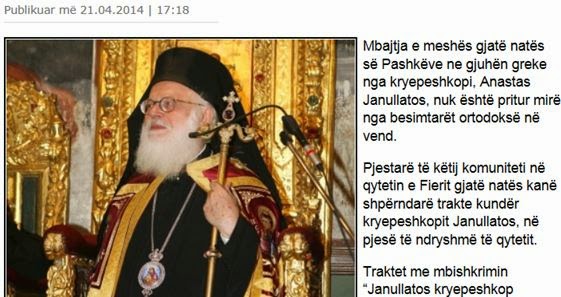 Το βράδυ της Ανάστασης ο Αρχιεπίσκοπος Αλβανίας Αναστάσιος λειτούργησε στην ελληνική γλώσσα και αυτό δεν έγινε αποδεκτό από τους Ορθόδοξους πιστούς στη χώρα, γράφει το αλβανικό δημοσίευμα.