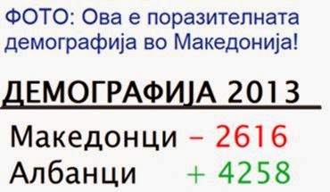 Ενδεικτική απόδειξη είναι η ‘κορνίζα’ (φωτό επάνω) που παρουσιάζει η σλαβική τηλεόραση Sitel στην οποία- Χωρίς Σχόλια- δημοσιεύει την «καταστροφική δημογραφική εξέλιξη στο νοτιοσλαβικό κράτος», όπου οι γεννήσεις του σλαβικού πληθυσμού κατά το 2013 έχουν τον αρνητικό αριθμό, μείον 2616 γεννήσεις από ό, τι το 2012, ενώ οι Αλβανοί έχουν θετικό αριθμό, συν 4258 γεννήσεις από ό, τι το 2012. πηγη