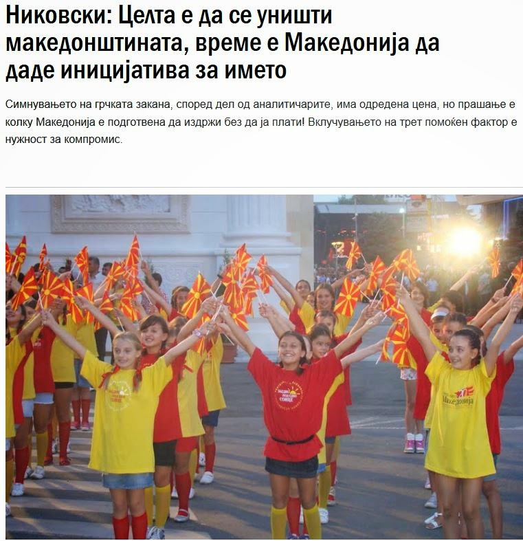 «Το πρόβλημα είναι τελείως ασύμμετρο και οποιαδήποτε επίλυσή του θα φέρει μόνο προβλήματα στο εσωτερικό της χώρας. Από την άλλη πλευρά, εάν οι ΗΠΑ θέλουν να προστατεύσουν τη χώρα μας, το λαό και τη γλώσσα μας τόσο από την Ελλάδα όσο και από τη Βουλγαρία, θα πρέπει να βρουν μία λύση σύντομα.