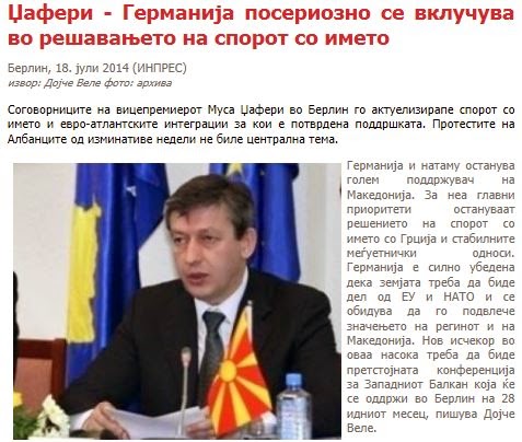 Σημειώνεται ότι ο Μούσα Τζαφέρι, ως αναπληρωτής πρωθυπουργός των Σκοπίων πλήρωσε επίσκεψη εργασίας στο Βερολίνο και είχε συνομιλίες με τον γερμανό διπλωμάτη Christoph Heusgen– σύμβουλο εξωτερικής πολιτικής και πολιτικής ασφάλειας της Καγκελαρίου Μέρκελ, τον διπλωμάτη Markus Ederer, υφυπουργό στο υπουργείο Εξωτερικών της Γερμανίας και τον Hans–Gert Pöttering, επικεφαλής του Ιδρύματος Κόντραντ Αντενάουερ- Konrad–Adenauer–Stiftung.