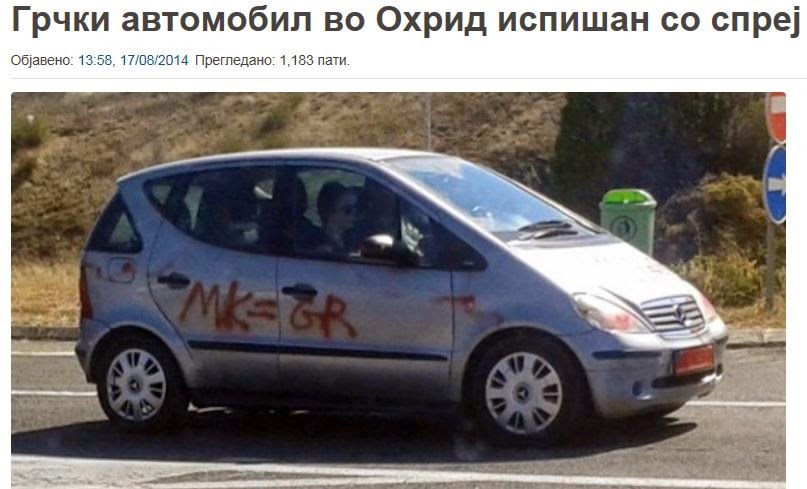 Έγραψε με κόκκινο σπρέι, τόσο στις πινακίδες κυκλοφορίας, όσο και στα πλαϊνά του αυτοκινήτου «ΜΚ is not Gr» και “GR=MK”.