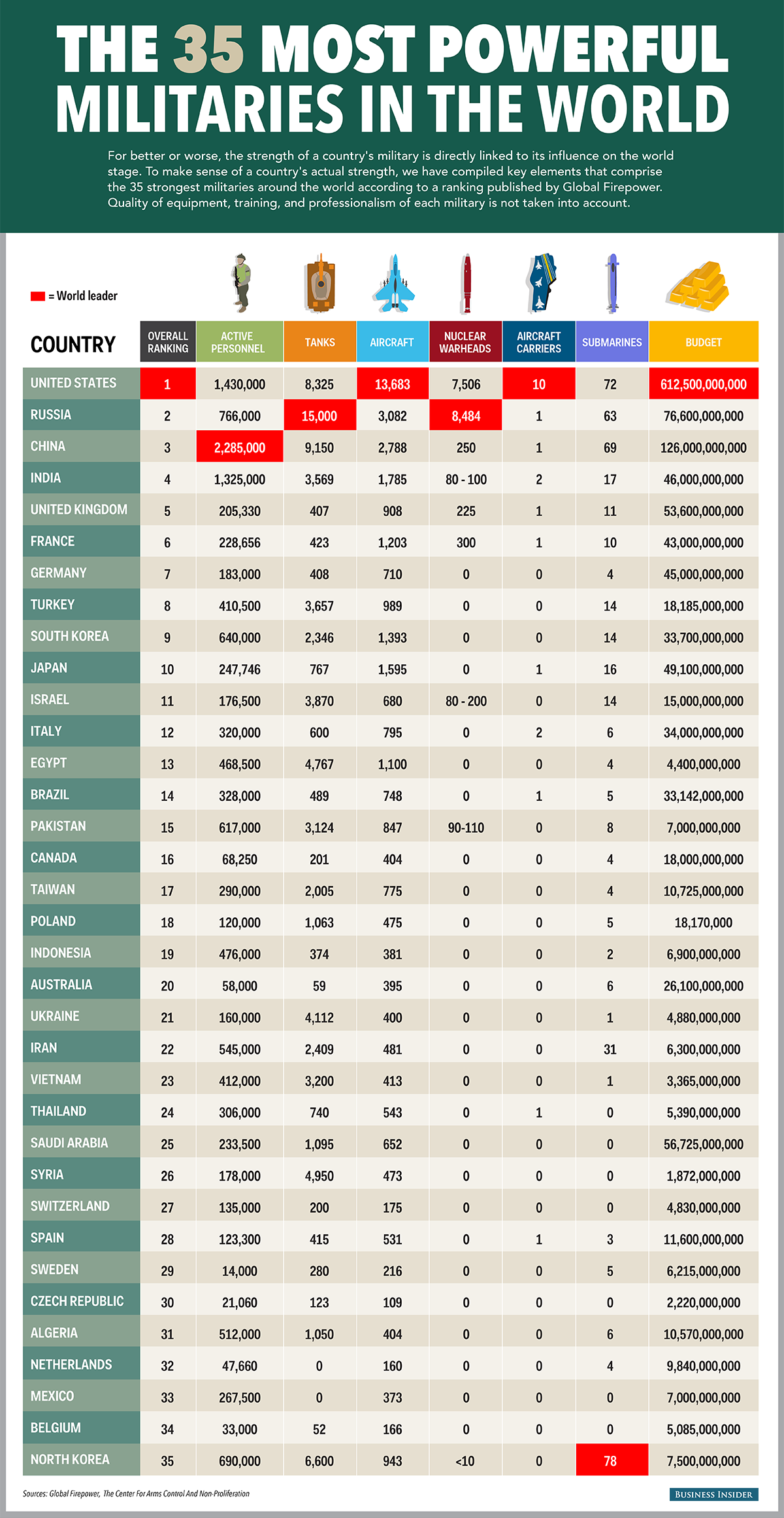 Το περιοδικό έχει δημιουργήσει ένα διάγραμμα για να συγκρίνει τους 35 πιο μεγάλους στρατούς, σύμφωνα με τον Παγκόσμιο Δείκτη δύναμη πυρός.