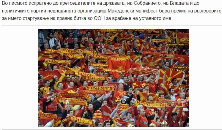 «Βρισκόμαστε αντιμέτωποι εμπρός σε ένα γεγονός στο οποίο η συνέχιση των συνομιλιών σχετικά με το ζήτημα του ονόματος που είναι εντελώς αντιπαραγωγικές και ενδέχεται να μας οδηγήσουν σε ταπείνωση», αναφέρει το «Μακεδονικό Μανιφέστο» των Σλάβων εθνικιστών που καλούν να δοθεί τέρμα σε αυτήν τη διαδικασία.