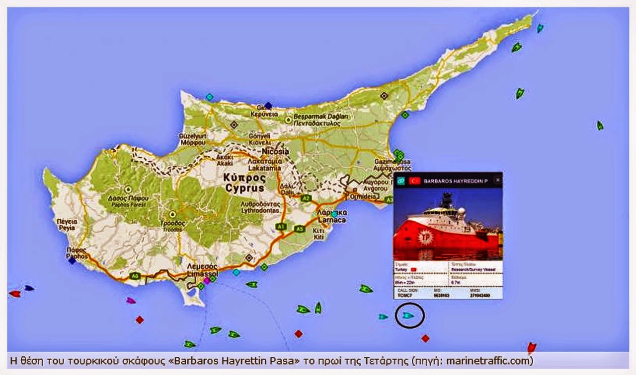 Τις ημέρες που το ερευνητικό σκάφος-πλατφόρμα Saipem 10000 του κονσόρτσιουμ ENI- KOGAZ έπλεε προς το Οικόπεδο 9, όπου εγκαταστάθηκε για να εκτελέσει τις διερευνητικές γεωτρήσεις, η Τουρκία έστειλε στην ευρύτερη περιοχή το δικό της ερευνητικό σκάφος «Μπαρμπαρός», συνοδευόμενο από δυο φρεγάτες, με σκοπό να εκφοβίσει τους Ιταλούς και τους Κορεάτες και να εκτρέψει με τον τρόπο αυτό το χρονοδιάγραμμα εκμετάλλευσης των ενεργειακών αποθεμάτων αλλά και των ρου των εξελίξεων, όπως αυτές έχουν προδιαγραφεί από τις προαναφερθείσες ενέργειες της Κυπριακής Δημοκρατίας.