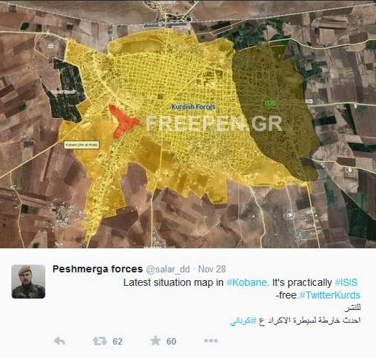 Ένας νέος χάρτης της μάχης του Κομπάνε δόθηκε στη δημοσιότητα από τις δυνάμεις των μαχητών Peshmerga ο οποίος δείχνει πλέον την πλήρη ανατροπή μετά από δύο μήνες σκληρών μαχών για την υπεράσπιση της πόλης.