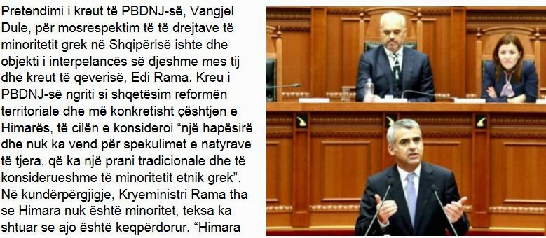 «Ο ισχυρισμός του επικεφαλής του Κόμματος της Ένωσης Ανθρωπίνων Δικαιωμάτων- ΚΕΑΔ- PBDNJ, Βαγγέλης Ντούλες, σύμφωνα με ερώτηση που απηύθυνε στο αλβανικό κοινοβούλιο, για την μην τήρηση των δικαιωμάτων της ελληνικής μειονότητας στην Αλβανία, ο πρωθυπουργός της Αλβανίας, Έντι Ράμα, χθες, απάντησε σε αυτά τα ερωτήματα, γράφει η ‘gazeta Shqip’.