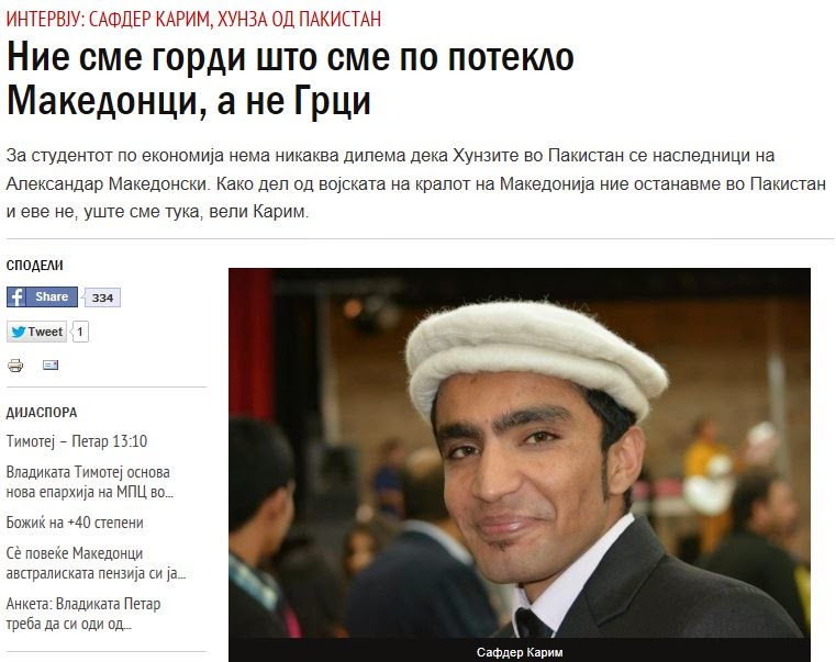 Για το φοιτητή της Οικονομίας- γράφει το σλαβικό κείμενο- δεν έχει καμία αμφιβολία ότι η φυλή Χούνζα του Πακιστάν, είναι διάδοχος του Αλεξάνδρου της Μακεδονίας. Ως μέρος του στρατού του βασιλιά της Μακεδονίας, οι πρόγονοί μας έμειναν στο Πακιστάν, λέει ο Καρίμ.