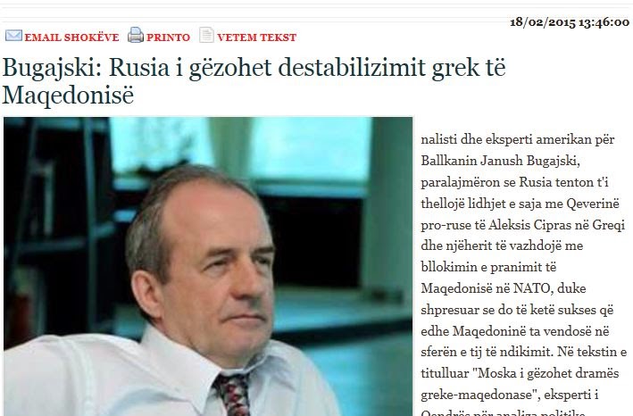 Ο Αμερικανός ειδικός αναλυτής για τα Βαλκάνια, Janusz Bugajski, προειδοποιεί, ότι η Ρωσία σκοπεύει να εμβαθύνει τους δεσμούς της με τη φιλο-ρωσική κυβέρνηση του Αλέξη Τσίπρα στην Ελλάδα, αλλά και να συνεχίσει (η Ελλάδα) να μπλοκάρει την ένταξη των Σκοπίων στο ΝΑΤΟ, με την ελπίδα να πετύχει, ώστε η πρώην γιουγκοσλαβική δημοκρατία- FYROM, να εισέλθει στη σφαίρα επιρροής της.