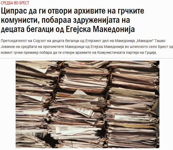 Ο Τάσκο Γιοβάνοφ, πρόεδρος του Συλλόγου «Των παιδιών των προσφύγων από τη Μακεδονία» κατά τη συνάντησή τους στο χωριό Μπρεστ του Στιπ, ζήτησε σε ομιλία του από τον πρωθυπουργό της Ελλάδας, Αλέξη Τσίπρα να ανοίξει τα αρχεία του Κομμουνιστικού κόμματος Ελλάδας.
