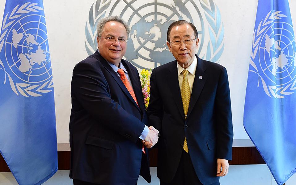 Κίνηση επανατοποθέτησης του Κυπριακού σε νέα διαπραγματευτική βάση, ώστε να μετατοπιστεί από την ατζέντα που θέτει η Τουρκία, δηλαδή τον εκ των προτέρων διαμοιρασμό των φυσικών πόρων της Κυπριακής ΑΟΖ, έκανε ο υπουργός Εξωτερικών Νίκος Κοτζιάς κατά την συνάντησή του με τον γγ του ΟΗΕ Μπαν Κι Μουν την Παρασκευή στη Νέα Υόρκη. Επίσης, αποκάλυψε ότι εξελίσσεται ο διάλογος με την ΠΓΔΜ σε διμερές επίπεδο, με στόχο μια συμφωνία πάνω σε Μέτρα Οικοδόμησης Εμπιστοσύνης μεταξύ των δύο χωρών