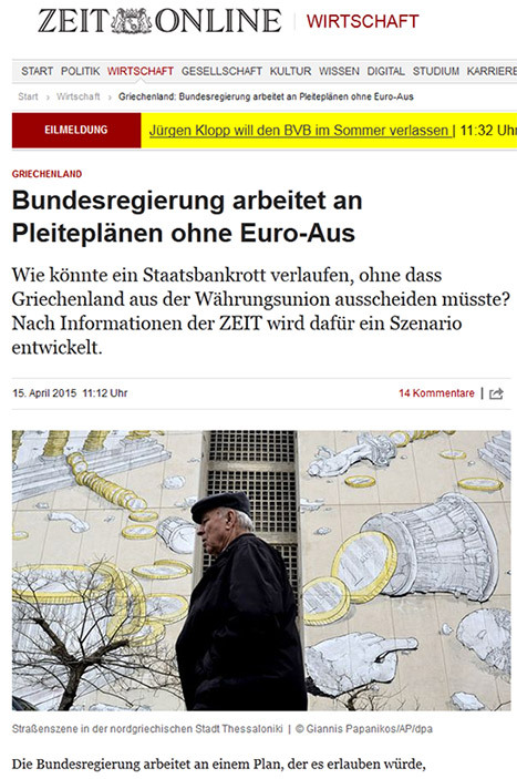 Αληθινή ή όχι θα φανεί μέσα στις επόμενες ημέρες… «Η γερμανική κυβέρνηση επεξεργάζεται ένα σχέδιο χρεοκοπίας της Ελλάδας χωρίς την έξοδο της χώρας από το ευρώ» είναι ο τίτλος δημοσιεύματος της εφημερίδας «Die Zeit», η οποία, επικαλούμενη κυβερνητικές πηγές του Βερολίνου, αποκαλύπτει ότι υπάρχει σενάριο για πτώχευση της Ελλάδας χωρίς την αποχώρησή της από την ευρωζώνη.