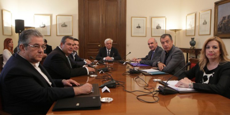 Ο Πρωθυπουργός, Αλέξης Τσίπρας, ο κυβερνητικός εταίρος, Πάνος Καμμένος, ο μεταβατικός Πρόεδρος της Νέας Δημοκρατίας, Βαγγέλης Μείμαράκης, η Πρόεδρος του ΠΑΣΟΚ, Φώφη Γεννηματά, ο αρχηγός του «Ποταμιού», Σταύρος Θεοδωράκης και ο Γραμματέας του ΚΚΕ, Δημήτρης Κουτσούμπας, μετά από συνεδρίαση στο Προεδρικό Μέγαρο υπό του Προέδρου της Δημοκρατίας Προκόπη Παυλόπουλου, που διήρκεσε έξι ώρες κατέληξαν σε μια κοινή γραμμή ενόψει της έναρξης των νέων διαπραγματεύσεων με τους δανειστές.