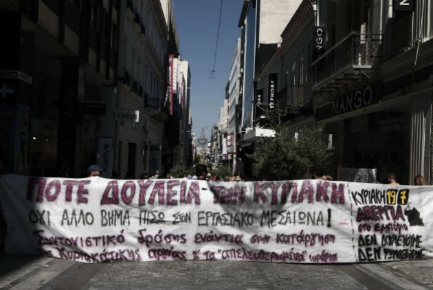 Το συντονιστικό δράσης ενάντια στην κατάργηση της Κυριακάτικης αργίας και ο σύλλογος Υπαλλήλων Βιβλίου Χάρτου Αττικής πραγματοποίησαν αποκλεισμό καταστημάτων σε δύο τετράγωνα της Ερμού από τις 10:30 σχεδόν έως τις 2 μ.μ., οπότε συνέχισε με πορεία μέχρι το Μοναστηράκι.