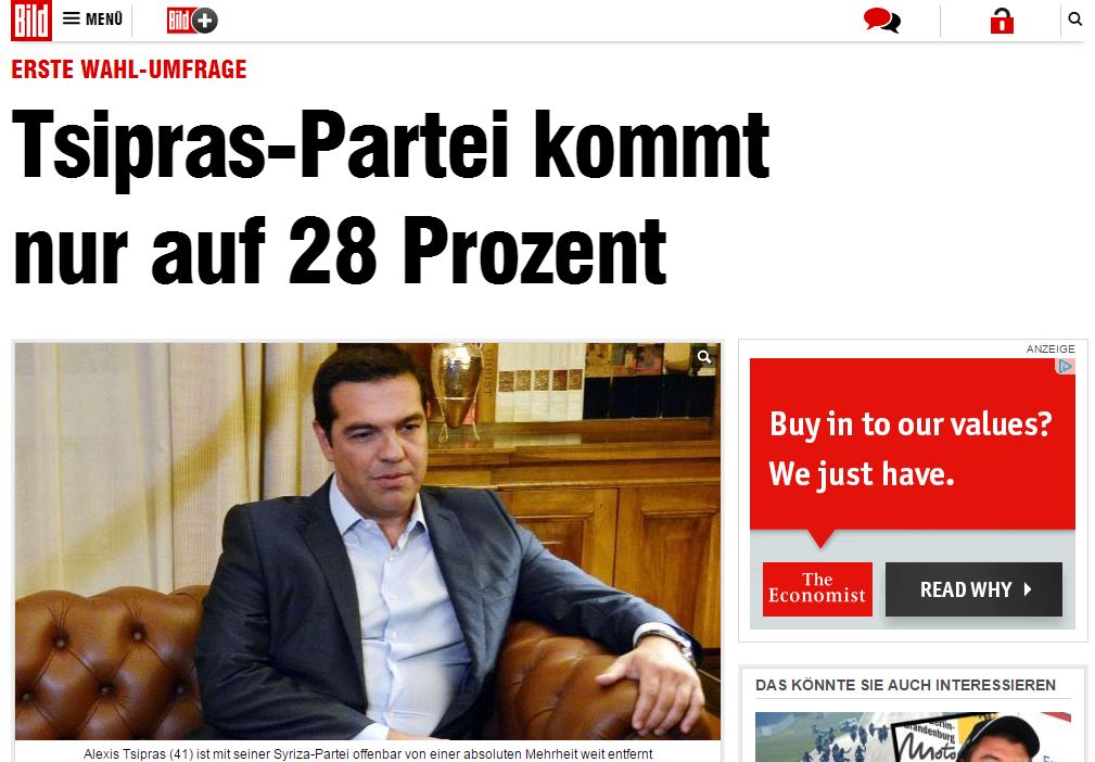 Μόλις 3% απέχει ο ΣΥΡΙΖΑ από τη ΝΔ ΣΥΡΙΖΑ, σύμφωνα με εσωτερική δημοσκόπηση, την οποία δημοσιεύει η γερμανική εφημερίδα «Bild», σχολιάζοντας ότι ο παραιτηθείς Έλληνας πρωθυπουργός βρίσκεται μακριά από την απόλυτη πλειοψηφία στις εκλογές της 20ης Σεπτεμβρίου.