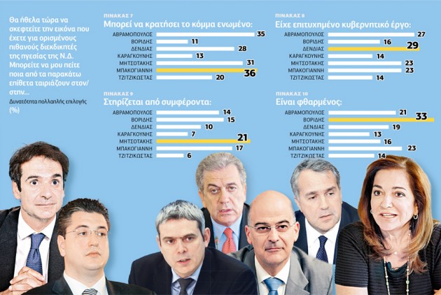 Ενα άλλο εύρημα, πάντοτε μεταξύ των ψηφοφόρων της Ν.Δ., είναι η φυσιολογική επικράτηση της Ντόρας Μπακογιάννη (με 54%), ως και η παλαιότερη από τα εν ενεργεία πολιτικά στελέχη της οικογένειας Μητσοτάκη, στο ερώτημα ποιος «εκφράζει περισσότερο τον “μητσοτακικό πόλο” στο κόμμα της Ν.Δ.» (πίνακας 3).