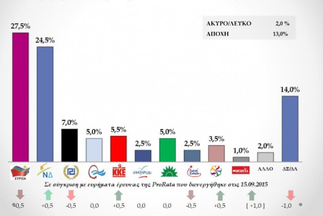 Στην πρόθεση ψήφου ο ΣΥΡΙΖΑ έχει ποσοστό 27,5%, η Ν.Δ 24,5% και ακολουθούν: Χρυσή Αυγή 7%, ΚΚΕ 5,5%, Ποτάμι 5%, ΠΑΣΟΚ-ΔΗΜΑΡ 5%, Ένωση Κεντρώων 3,5%, Λαϊκή Ενότητα 2,5%, Ανεξάρτητοι Έλληνες 2,5%, ΑΝΤΑΡΣΥΑ 1%, «Άλλο» 2%, «Δεν ξέρω/Δεν απαντώ 14%, Άκυρο/Λευκό 2%, Αποχή 13%.