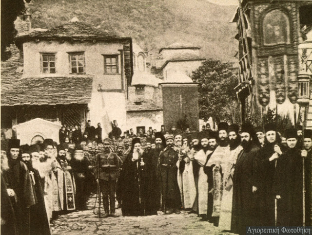 Αναχώρηση των εκκλησιαστικών, πολιτικών και στρατιωτικών αρχών της Χαλκιδικής από τη μονή Ιβήρων(25 Νοεμβρίου 1912)(Φωτογραφία: Προκόπιος ιεροδιάκονος) |