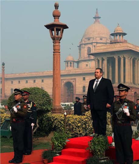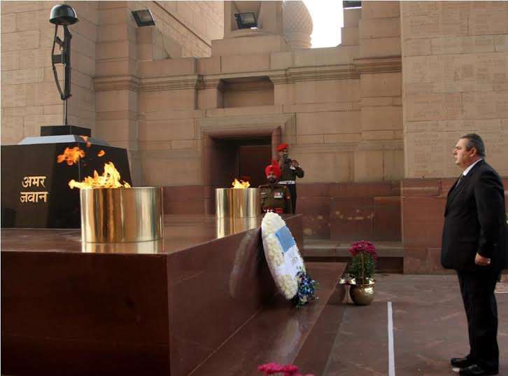 Ο Υπουργός Εθνικής Άμυνας Πάνος Καμμένος, στο πλαίσιο της επίσημης επίσκεψης που πραγματοποιεί στην Ινδία, κατέθεσε στεφάνι στην Πύλη της Ινδίας (India Gate).Στη συνέχεια συναντήθηκε με τον Υπουργό Άμυνας της Ινδίας Manohar Parrikar και τον Αναπληρωτή Υπουργό Εξωτερικών Vijay Kumar Singh.