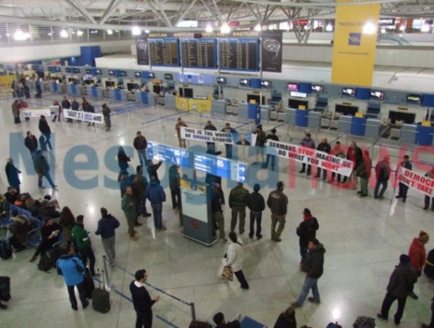 Κατευθύνθηκαν στην αίθουσα αφίξεων από ευρωπαϊκές χώρες και ξεδίπλωσαν πανό στα ελληνικά και στα αγγλικά.
