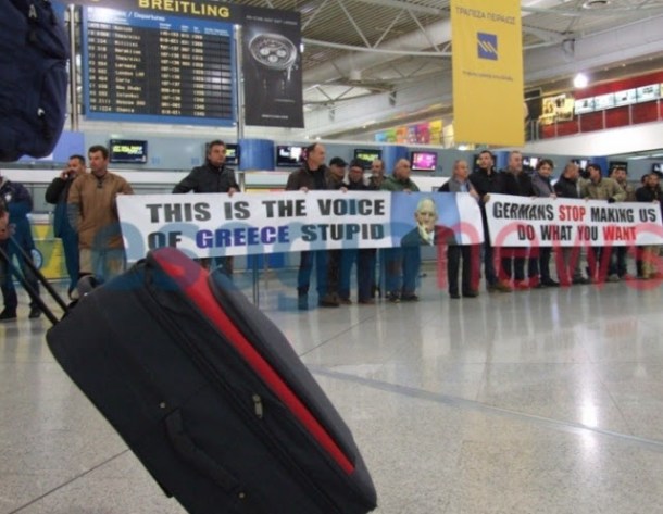 «Οχι στον αφανισμό των αγροτών», «Η Ευρώπη είναι ελληνική λέξη» και κρατούν και μια φωτογραφία του Βόλφκαγκ Σόιμπλε με την λεζάντα «this is the voice of Greece stupid».