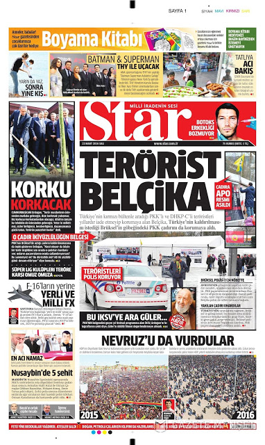 Η εφημερίδα Star, κανονικό φερέφωνο του Ερντογάν, στις 22 Μαρτίου 2016, δηλαδή την ημέρα των επιθέσεων στις Βρυξέλλες, κυκλοφόρησε ***με τον πηχυαίο τίτλο «Βέλγιο Χώρα-Τρομοκράτης» και φωτογραφίες Κούρδων που έχουν στα χέρια τους σημαίες της Ροζάβα, δηλαδή του αυτόνομου κουρδικού κράτους που ιδρύθηκε στη Β. Συρία, το οποίο αποτελεί μείζονα απειλή για την ίδια την Τουρκία.