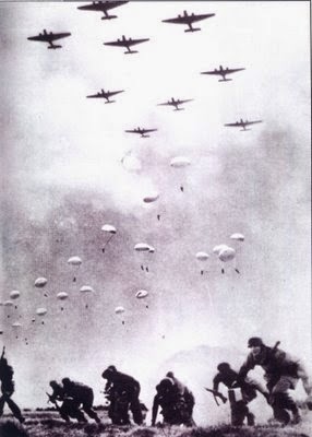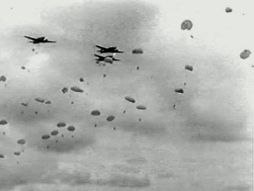 Η γη σείεται και αμέσως τα πρώτα κύματα των επίλεκτων γερμανικών τμημάτων αρχίζουν να πέφτουν κατά χιλιάδες, από τα αμέτρητα μεταγωγικά αεροπλάνα και ανεμόπτερα.