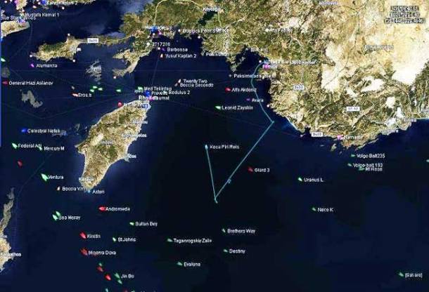 Το ΠΙΡΙ ΡΕΙΣ όπως φαίνεται και από την πορεία του που αποτύπωσε στο χάρτη ο Νίκος Τριάντης, πλέει περίπου 20 με 25 ναυτικά μίλια από τις ακτές της Ρόδου σε περιοχή ελληνικής ΑΟΖ.