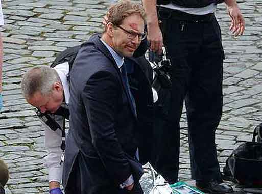 Ο Βρετανός βουλευτής, με βαμμενο το πρόσωπο από το αίμα και ματωμένα τα μανίκια του σακακιού του,παρέμεινε στο σημείο μέχρι και την έλευση του ελικοπτέρου-ασθενοφόρου, με το οποίο μεταφέρθηκε εσπευσμένα στο νοσοκομείο ο μαχαιρωμένος αστυνομικός.