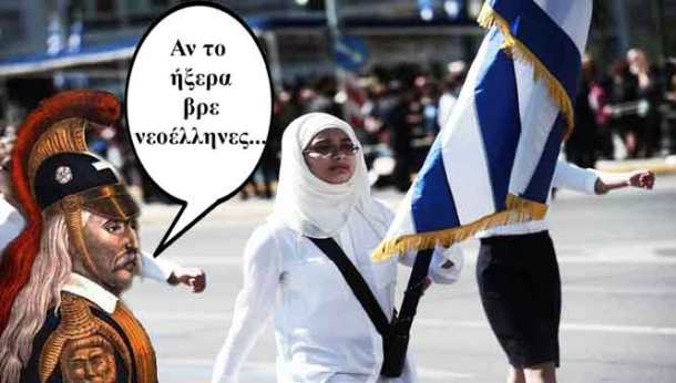 Η μουσουλμανική μαντίλα, αποτελεί για την Δύση και τις δυτικές γυναίκες σύμβολο της καταπίεσης των γυναικών από το Ισλάμ και παρουσιάζεται πάλι σε μία παρέλαση εθνικής επετείου η οποία γίνεται σε ιστορική υπόμνηση του αγώνα που έδωσε το Εθνος πριν από 196 χρόνια ακριβώς για να μην υπάρχει (και…) τέτοια καταπίεση.