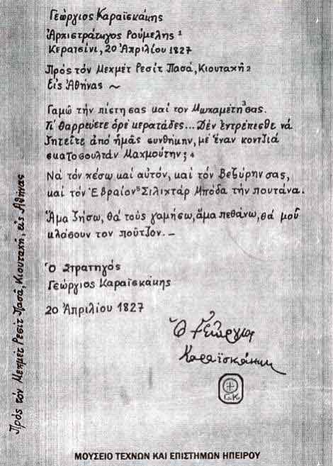 Η επανάσταση έχει πάρει την κάτω βόλτα. Οι καπεταναίοι τρώγονται μεταξύ τους. Ο Σουλτάνος, για να ξεκαθαρίσει το τοπίο έστειλε στην Ελλάδα μια στρατιά υπό τον περιβόητο Κιουταχή Πασά. Στρατοπέδευσε κάπου στην Αττική . Έστειλε μαντατοφόρους στον Έλληνα Αρχιστράτηγο Γεώργιο Καραϊσκάκη για να διαπραγματευθούν μαζί του για μια ταπεινωτική, για τους Έλληνες, συνθήκη. Ιδού η απάντηση του Καραϊσκάκη, που αργότερα θα κατατρόπωνε τον αλαζόνα Τούρκο.