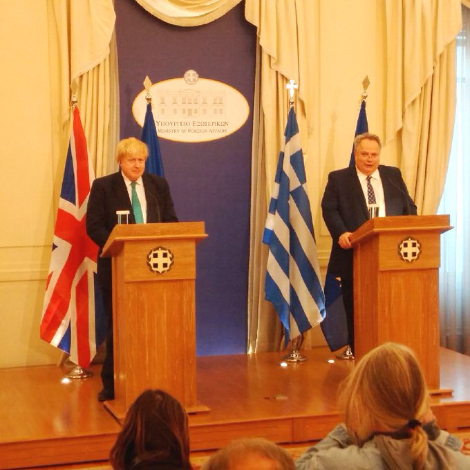 Την ευκαιρία να επιβεβαιώσουν τις στενές σχέσεις που συνδέουν Ελλάδα και Βρετανία, είχαν οι υπουργοί Εξωτερικών των δύο χωρών, κατά τη δίωρη συνάντησή τους που έλαβε χώρα στην Αθήνα. «Φεύγουμε από την Ε.Ε., αλλά όχι από την Ευρώπη», τόνισε ο Μπόρις Τζόνσον, με τον Νίκο Κοτζιά να τονίζει πως «σεβόμαστε την απόφαση του βρετανικού λαού και θέλουμε να διαμορφώσουμε ανάμεσα στην Ευρωπαϊκή Ένωση και το Ηνωμένο Βασίλειο, την κάλλιστη δυνατή συμφωνία».