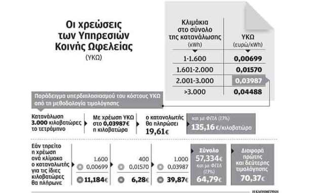 Ετσι, ενώ η κατανάλωση ενός μέσου νοικοκυριού το τετράμηνο κυμαίνεται γύρω στις 1.600-2.000 κιλοβατώρες, τους χειμερινούς μήνες με τη χρήση ηλεκτρικών συσκευών για θέρμανση και τους θερινούς για ψύξη αυξάνεται πάνω από τις 3.000 κιλοβατώρες, με αποτέλεσμα όλη η ενέργεια να επιβαρύνεται με την υψηλή χρέωση των ΥΚΩ χωρίς να λαμβάνεται υπόψη η χρέωση για τις χαμηλότερες κλίμακες καταναλώσεων.