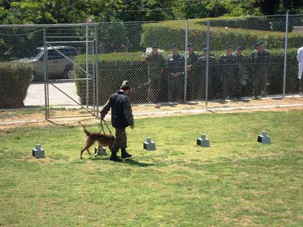 (2) Στο Κέντρο Βιολογικών Ερευνών Στρατού (ΚΒΙΕΣ) στην Αθήνα, όπου παρακολούθησε επίδειξη από στρατιωτικούς σκύλους.
