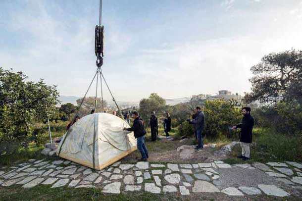 Μία σκηνή πρόσφυγα τοποθετείται απέναντι στο υπέρτατο μνημείο προς τιμή της πολεμικής αρετής των Ελλήνων.