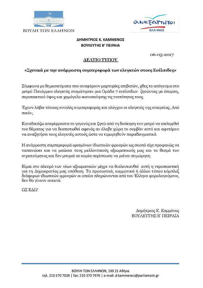 dkammenos-696×985 Published 7 Μαΐου, 2017 at 696 × 985 in Στείλτε e mail διαμαρτυρίας στο μετρό για την απρέπεια κατά των Ευέλπιδων – Στη Βουλή το θέμα με τον έλεγχο των Ευέλπιδων στο μετρό με ερώτηση Γεωργιάδη – Πρώτη επίσημη αντίδραση στη Βουλή για τους Ευέλπιδες στο μετρό από τον Δημ.Καμμένο ← Προηγούμενο Επόμενο →