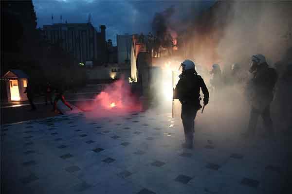Σοβαρά επεισόδια ξέσπασαν έξω από τη Βουλή όταν μια μεγάλη ομάδα διαδηλωτών επιχείρησε να ανέβει στο περιστύλιο της Βουλής μπροστά από το μνημείο του Άγνωστου Στρατιώτη.