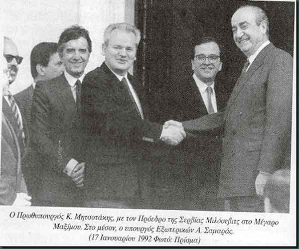 Και για να διώξει απο πάνω του κάθε ιστορική ευθύνη, τα έριξε όλα στον Υπουργό Εξωτερικών, τον Αντώνη τον Σαμαρά, ο οποίος σύμφωνα με τον πολιτικό δεινόσαυρο «τα έκανε μούσκεμα». Φυσικά το «μούσκεμα» του Μητσοτάκη αφορά τις αντιδράσεις και αντιρρήσεις του Υπουργού Εξωτερικών να κάνει πίσω, να ρεζιλευτεί η χώρα και ο ίδιος προσωπικά, όταν ο ίδιος ο Μιλόσεβιτς -τον οποίον «περιποιήθηκαν» αρμοδίως οι… φίλοι και… σύμμαχοι στέλνοντάς τον στον άλλο κόσμο!- είχε προτείνει ΣΥΝΟΡΑ ΜΕ ΤΗΝ ΣΕΡΒΙΑ!