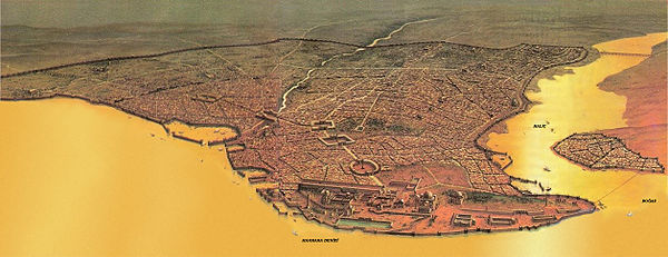 Ο αυτοκράτορας Κωνσταντίνος Α΄, το 330 μ.χ. την μετονόμασε Νέα Ρώμη, όνομα που δεν επικράτησε καθώς η πόλη έγινε γρήγορα γνωστή ως Κωνσταντινούπολη από το όνομα του νέου ιδρυτή της. Άλλες ονομασίες που της αποδόθηκαν είναι Βασιλεύουσα, Βασιλίς των πόλεων, Μεγαλόπολις και Επτάλοφος.» el.wikipedia.org