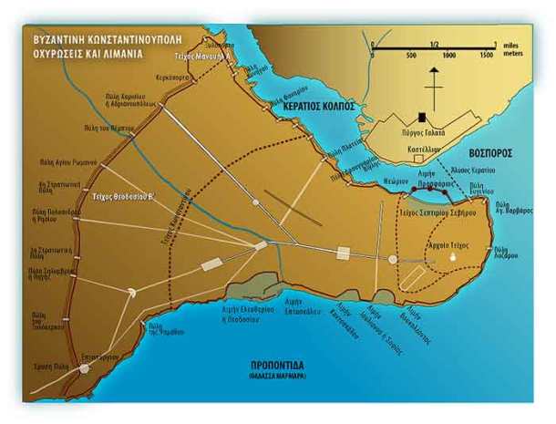 Το τείχος της Προποντίδας, που ξεκινούσε από την Ακρόπολη και έφτανε ως την αποβάθρα των Πηγών, είχε ύψος 12 ως 15 μ., διέθετε 188 πύργους, περίπου 13 πύλες και είχε μήκος 8.900 μ. Σχεδόν σε όλο το μήκος το τείχος της Προποντίδας ήταν δίπλα στη θάλασσα, επομένως η αποβίβαση εχθρικών δυνάμεων ήταν αδύνατη και το έργο της άμυνας καθίστατο πιο εύκολο.» e-didaskalia.blogspot.com